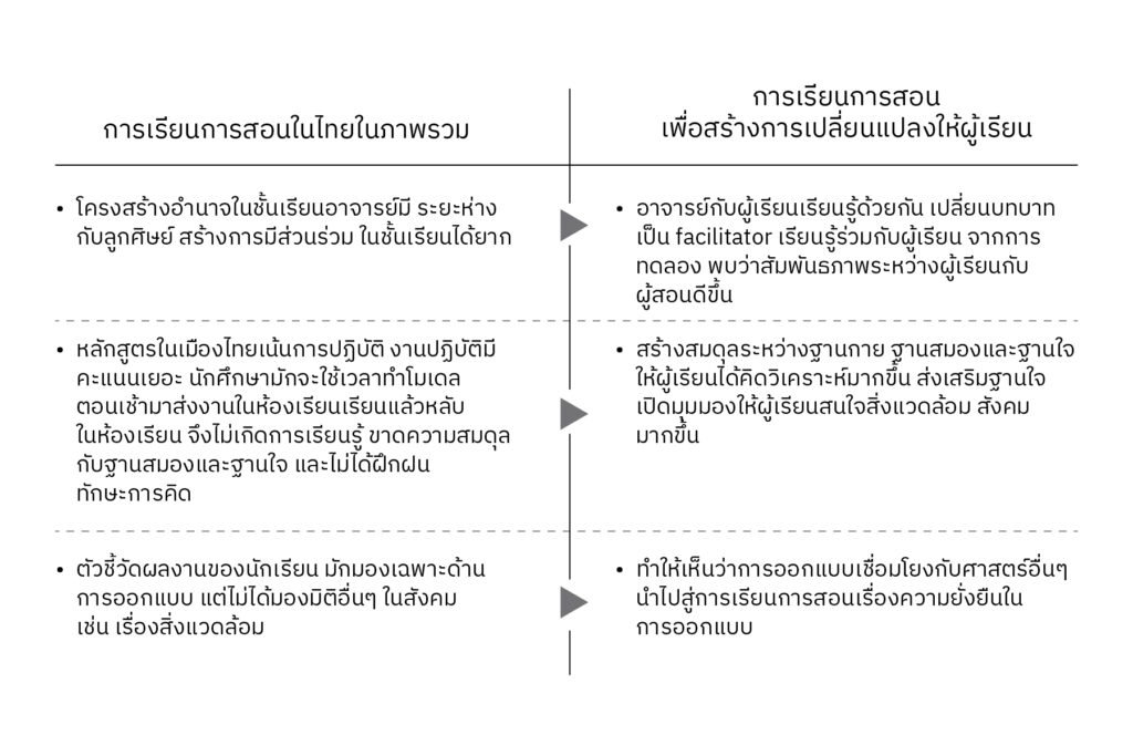 เรื่องราวทั้งหมดนี้ทำให้รู้สึกตื่นเต้นที่มีการเรียนรู้เรื่องความยั่งยืนในสถาบันการศึกษาในประเทศไทย ทั้งยังมีกระบวนการเรียนการสอน การทำกิจกรรมที่น่าสนใจและสร้างการเปลี่ยนแปลงได้จริง อดคิดไม่ได้ว่าอยากให้การเรียนรู้เช่นนี้กระจายไปสู่สถาบันการศึกษาทั่วประเทศและไม่ต้องสงสัยเลยว่าผู้ที่ได้เรียนรู้สิ่งเหล่านี้จะกลายเป็นนักออกแบบที่ใส่ใจความยั่งยืน เป็น “ผู้นำการเปลี่ยนแปลง” ที่สร้างผลกระทบเชิงบวกให้สังคมได้อีกมากอย่างแน่นอน