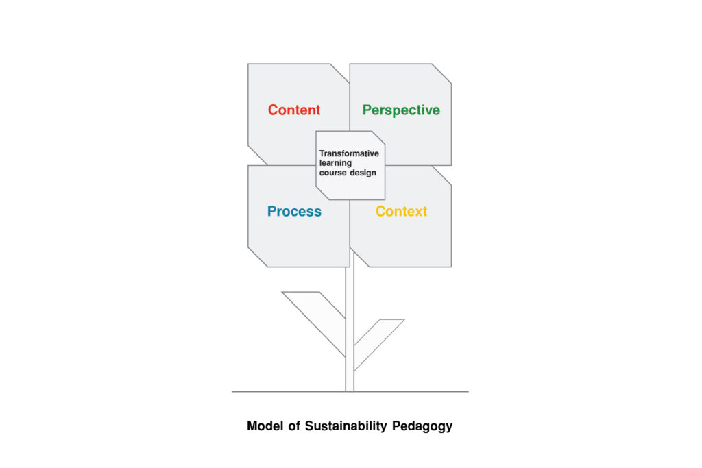 ทั้งนี้ การสร้างการเรียนการสอนที่สร้างความเปลี่ยนแปลงในผู้เรียนได้นั้นเป็นการเรียนการสอนที่มี องค์ประกอบครบถ้วน 4 องค์ประกอบ ซึ่งมาจาก Model of Sustainability Pedagogy (Burns, 2011; Chotiratanapinun, 2018) นำเสนอในรูปแบบแผนภาพต้นไม้ ที่มีกลีบดอกไม้ 4 กลีบ สื่อถึงองค์ประกอบ 4 ประการคือ เนื้อหา (content) กระบวนการเรียนการสอน (process) การเปิดรับมุมมองที่หลากหลาย (perspectives) และ การเรียนการสอนที่เหมาะสมกับบริบท (context) มีรายละเอียดขององค์ประกอบ ทั้ง 4 ได้แก่